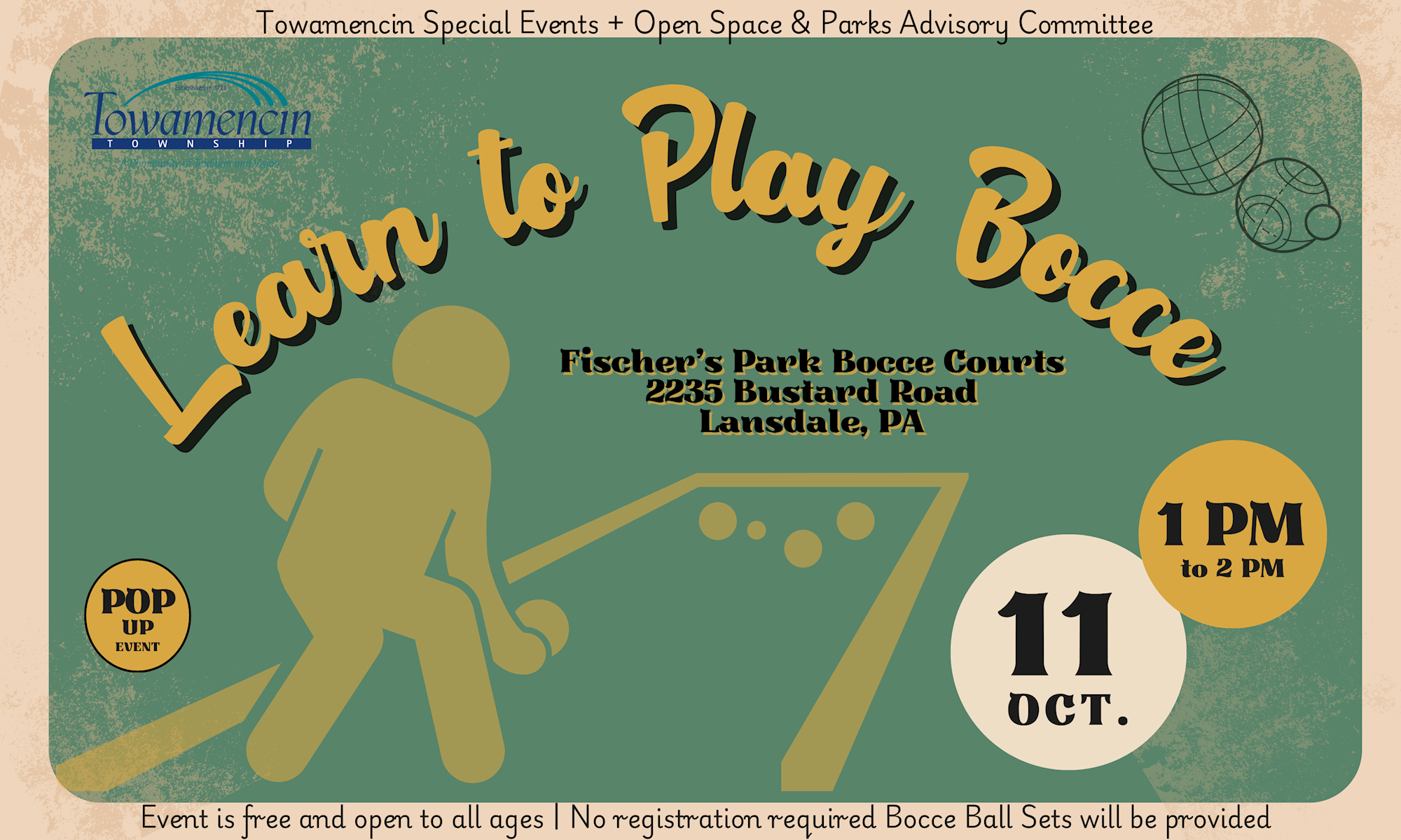 Join us this Saturday, 1:00–2:00 PM (weather permitting) for a free one-hour “Learn to Play Bocce” event at the bocce ball courts in Fischer's Park. All ages welcome, no bocce set needed—just come ready for some fun!