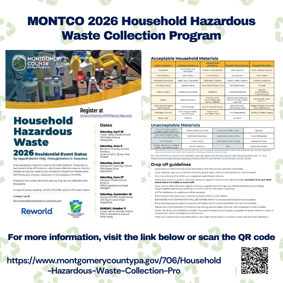 Registration is now available for the 2026 MontCo Household Hazardous Waste events. This collection is for residents only and not for businesses or contractors. Register here.