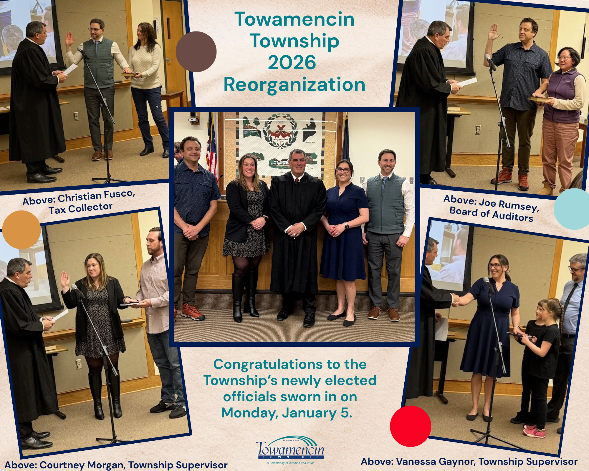 On Monday, January 5, Judge Levine swore in our newly elected officials: Township Supervisors Vanessa Gaynor and Courtney Morgan, Tax Collector Christian Fusco, and Board of Auditors member Joe Rumsey. Congrats to all!