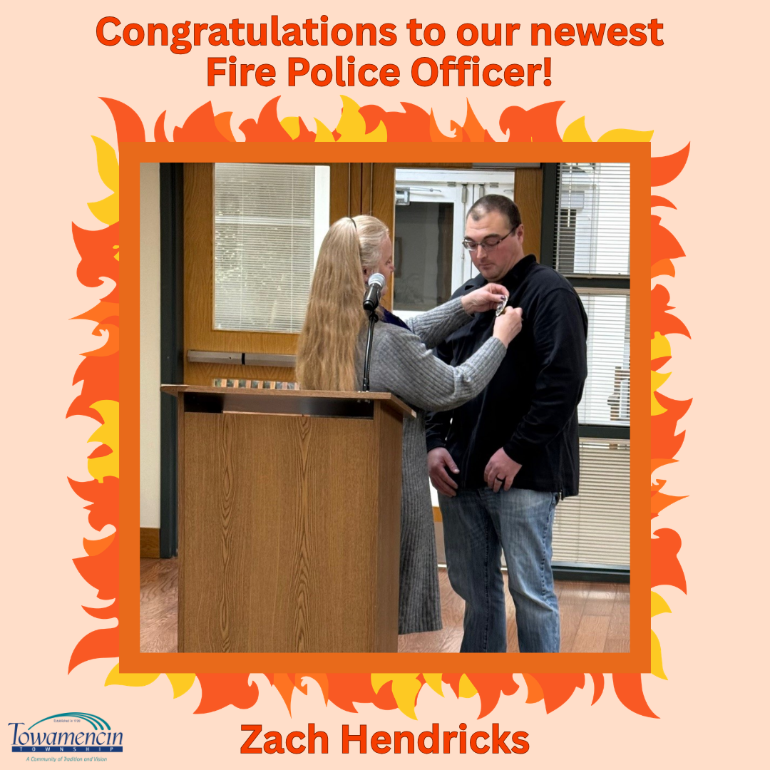 At the February 11 Board of Supervisors meeting, Zach Hendricks was sworn in as a Towamencin Fire Police Officer. Zach also works on the Township’s Public Works crew. Zach's commitment to public service and safety is evident. Let’s give Zach a round of applause for all he contributes to Towamencin Township!