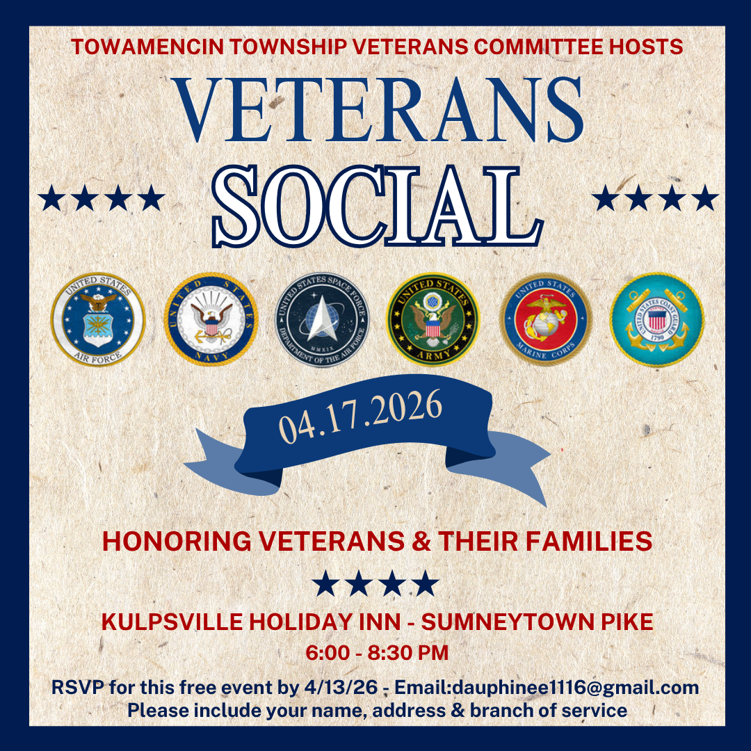 The Veterans Committee of Towamencin will host a “FREE” social gathering on Friday, April 17th, from 6 PM to 8:30 PM at the Kulpsville Holiday Inn on Sumneytown Pike. Veterans and their families are invited. Snacks, hors d’oeuvres, and beverages will be available. Alcohol will be available for purchase. This “FREE” event is for ALL Veterans of Towamencin and the surrounding communities. To attend, please email dauphinee1116@gmail.com by April 13, 2026, and include your name, address, and branch of service.
