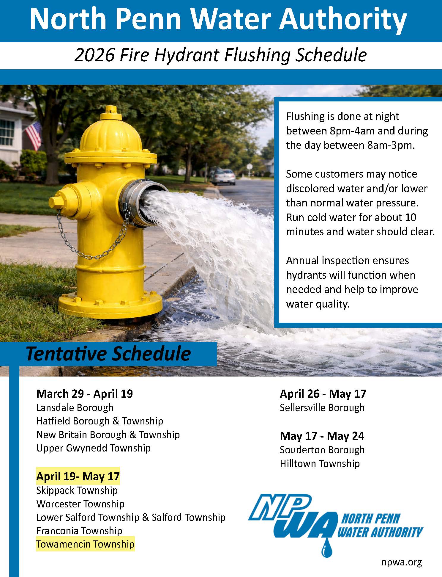 Tentative flushing in Towamencin Township is scheduled from April 19 to May 17. For more information, visit the North Penn Water Authority's website: npwa.org