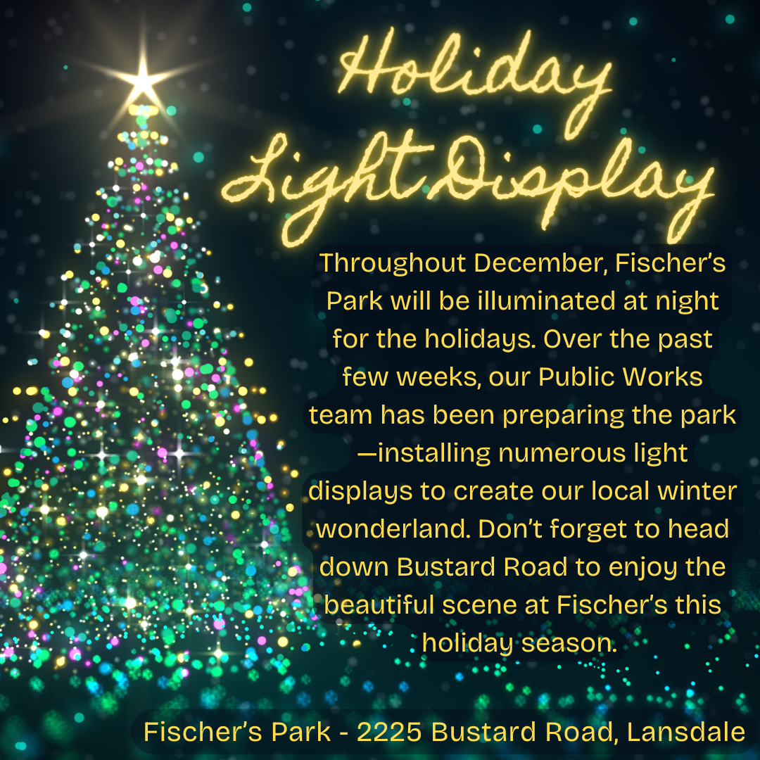 Throughout December, Fischer's Park will be illuminated at night for the holidays. So get out and take a ride down Bustard Road to enjoy the beautiful scene this holiday season. Lights are displayed weekly from 3:30 pm through 7:00 am, and on weekends, 24 hours from Friday at 3:30 pm through Monday at 7:00 am.
