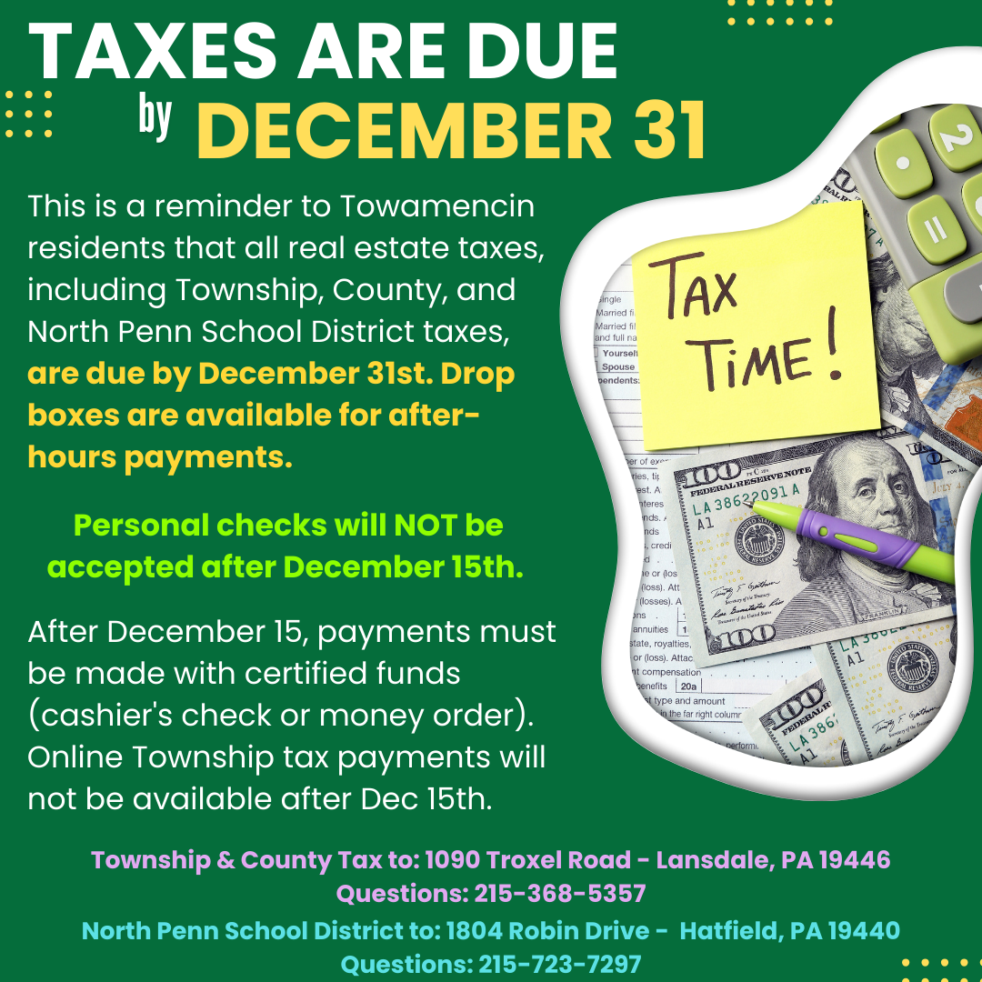 - Township and County taxes are paid to the Township. Payments can be made by mail or in person at the Township Administration Building, 1090 Troxel Rd, Lansdale.