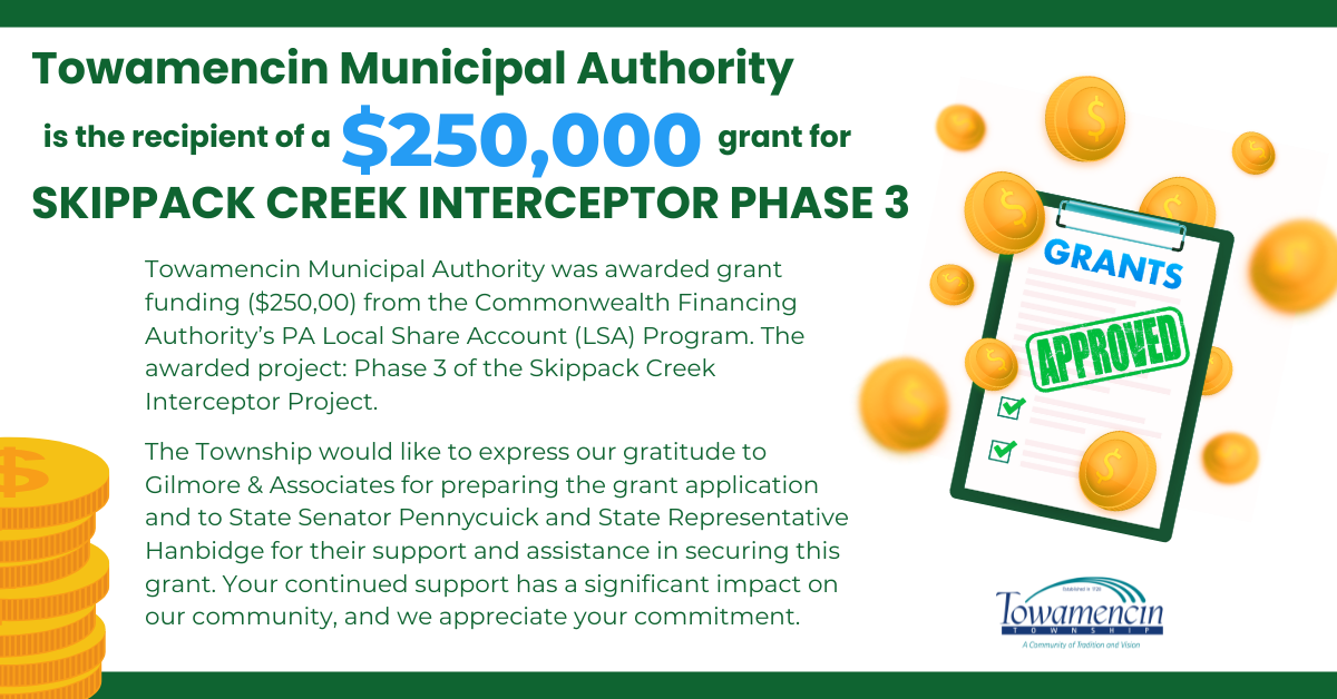 Towamencin Municipal Authority was awarded grant funding ($250,00) from the Commonwealth Financing Authority’s PA Local Share Account (LSA) Program. The awarded project consists of replacing the next section/phase of the Skippack Creek Interceptor.