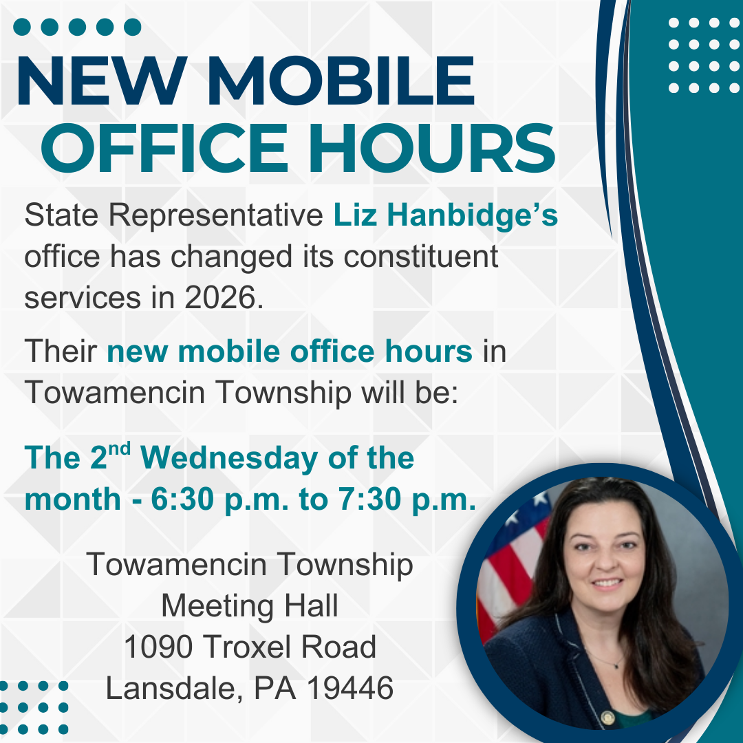 Meetings are open to the public, and residents are encouraged to attend. Meetings take place in the Meeting Hall Building of the Municipal Complex unless otherwise indicated. Meeting Hall address: 1090 Troxel Road, Lansdale. Additional parking is available at the adjacent Family Worship Center parking lot. If using the Church's lot, we ask that our guests park on the side closest to the Township property.