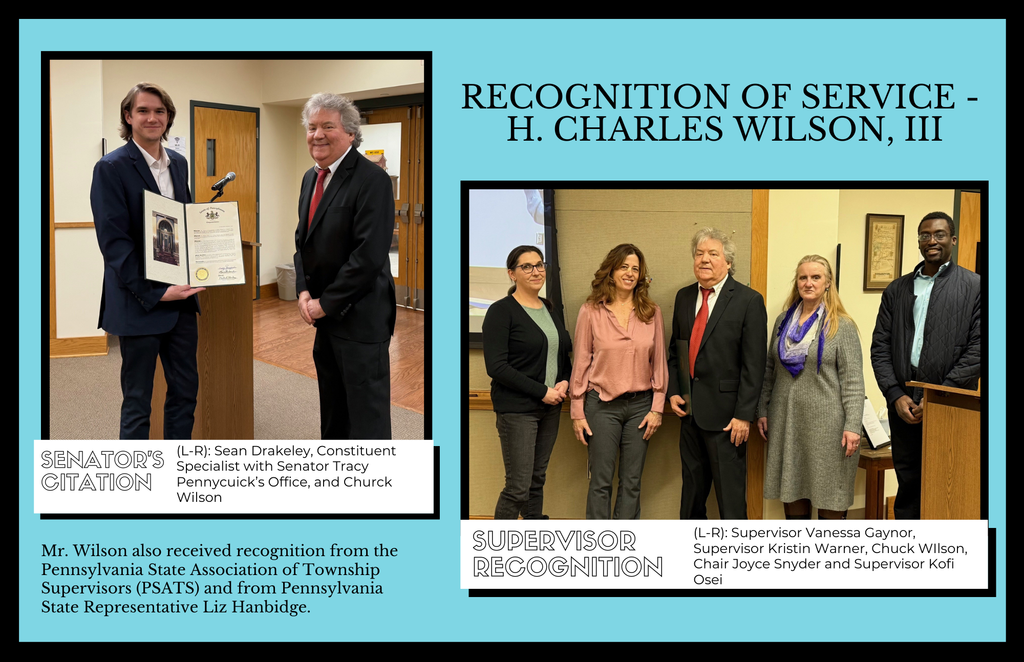 At the February 11th Board of Supervisors meeting, the supervisors recognized the service of former supervisor Chuck Wilson. Mr. Wilson served on the Township’s Board for 24 years, from 2002 until this past December, serving as Chairman from 2004 to 2005 and from 2015 to 2025. In addition, he served on several Towamencin Committees, including the Finance, Pension, Sewer Advisory, and Public Works Committees.