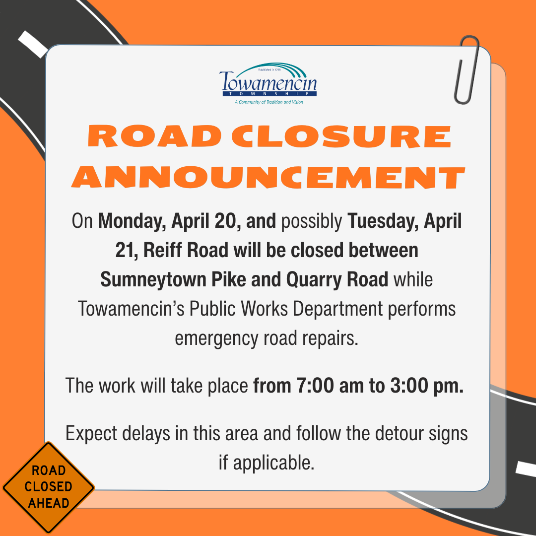 On Monday, April 20, and possibly Tuesday, April 21, Reiff Road will be closed between Sumneytown Pike and Quarry Road for emergency road repairs. Work will occur between 7 am and 3 pm. Expect delays in this area.