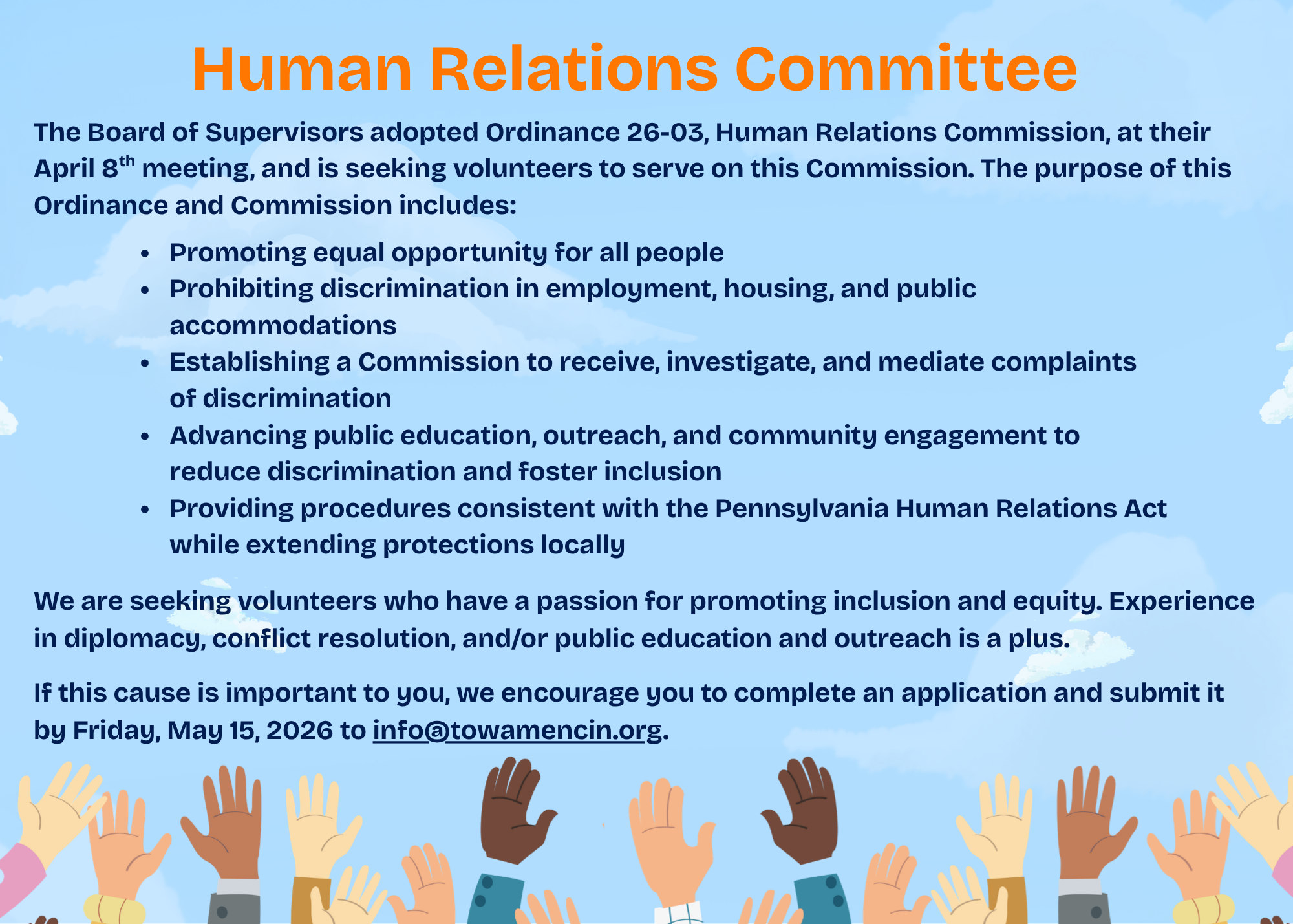 Interested individuals should complete and submit a volunteer application to info@towamencin.org by May 15.