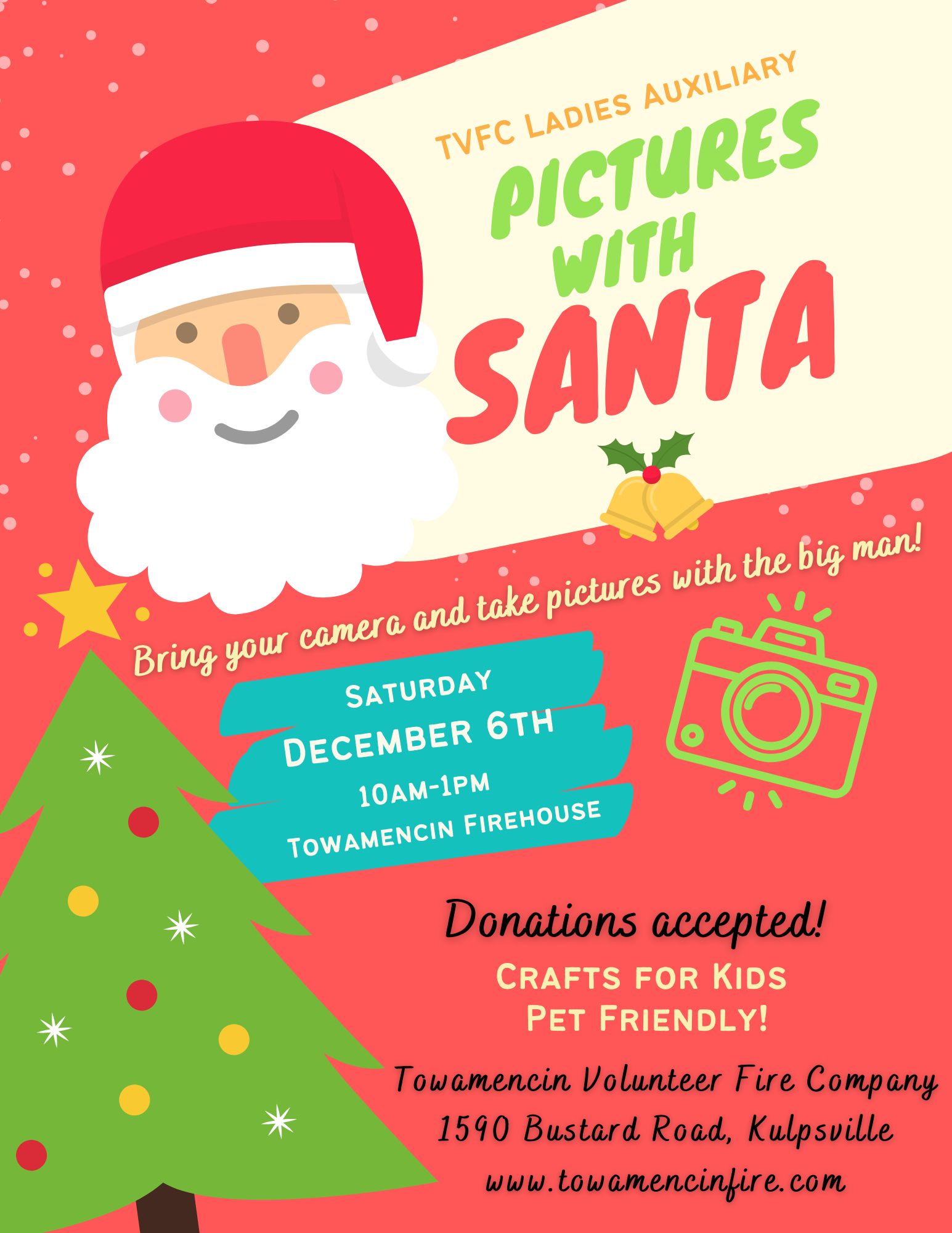 Bring the whole family and take some holiday photos with Santa. Let's remember that the holiday season is a time for giving and a perfect opportunity to acknowledge all that our volunteer Fire Company does for our community. This is a FREE event, but please consider making a donation to TVFC during your visit with Santa.