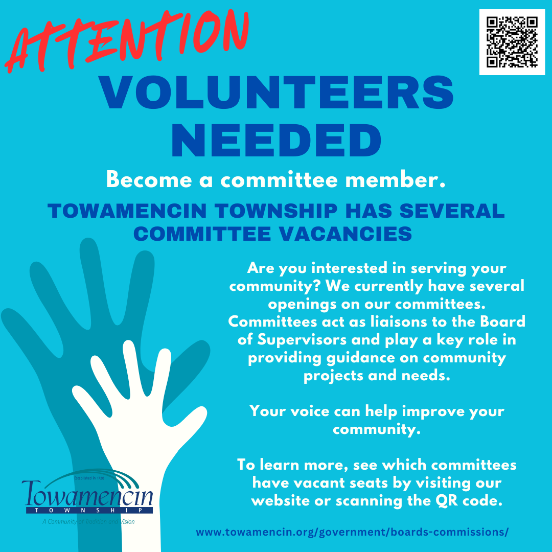 Scan the QR code or click here to learn more about our committees and vacancies. If interested, email your application to: info@towamencin.org.